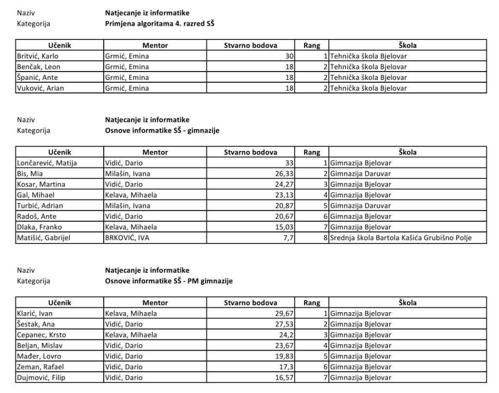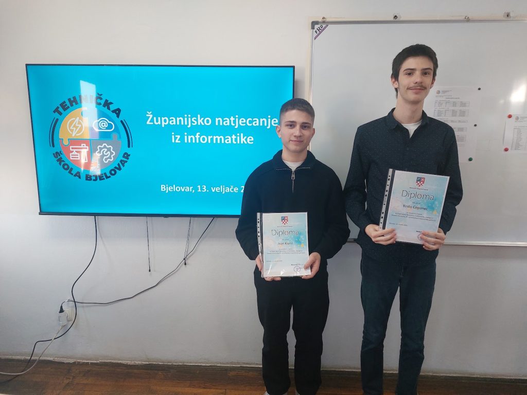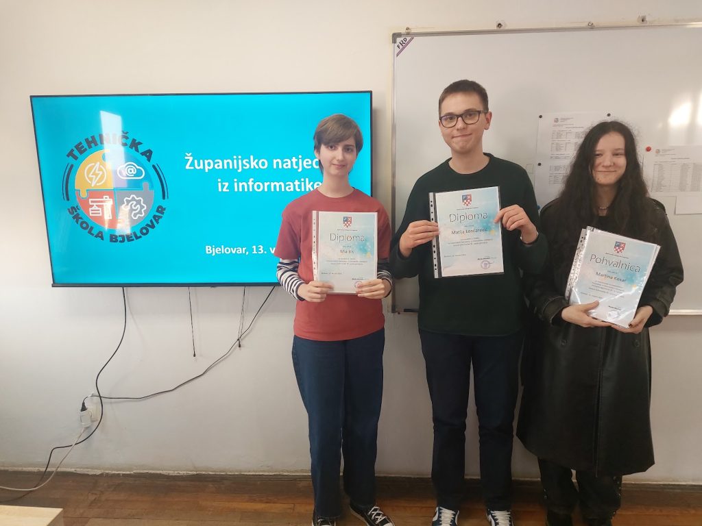U petak, 13. veljače u Tehničkoj školi Bjelovar održano je županijsko natjecanje iz informatike. Učenici Gimnazije Bjelovar natjecali su se u kategorijama: Primjena algoritama, Osnove informatike (PM) i Osnove informatike (OG).
