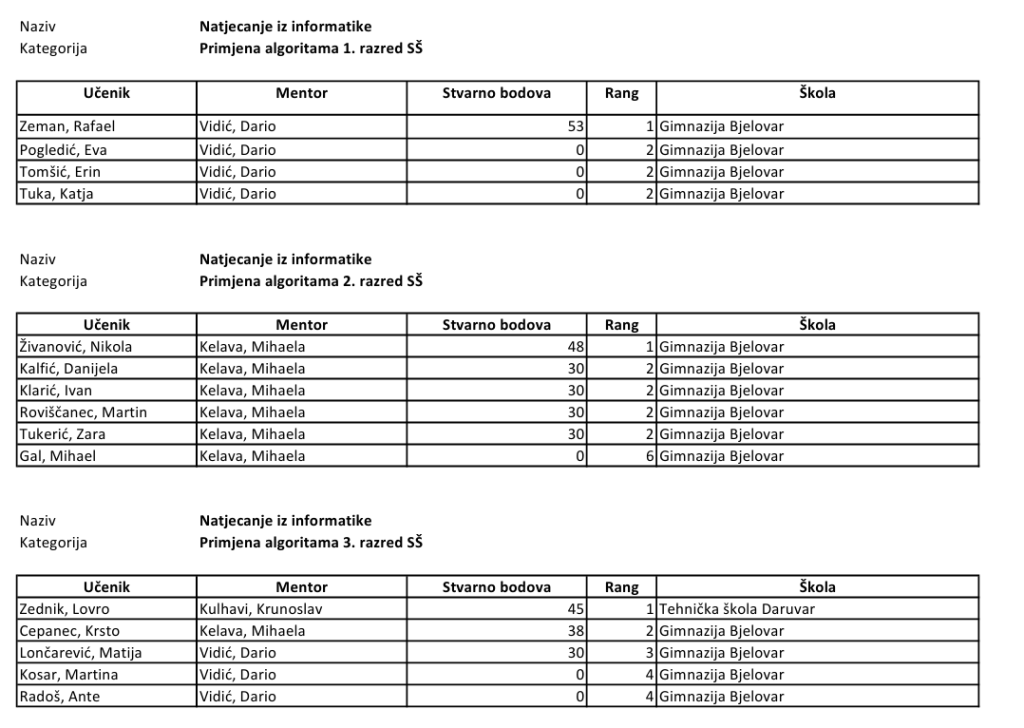 Učenici naše škole osvojili su prva mjesta u kategoriji Primjena algoritama za 1. razred te za 2. razred SŠ. Također, osvojili su prva mjesto u kategoriji Osnove informatike (gimnazije). Mentori naših učenika su Mihaela Kelava i Dario Vidić.